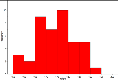 The histogram below displays the frequency distribution of the heights (in cm) of a sample of 42 people with class intervals of width 5 cm.