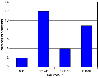 To construct a column graph, equal width rectangular bars are constructed for each category with height equal to the observed frequency of the category as shown in the example below which displays the hair colours of 27 students.