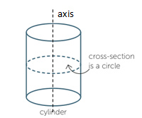A cylinder is a solid that has parallel circular discs of equal radius at the ends. Each cross-section parallel to the ends is a circle with the same radius, and the centres of these circular cross-sections lie on a straight line, called the axis of the cylinder.