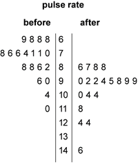 In this plot, the stem unit is ‘10’ and the leaf unit is ‘1’. Thus, the third row in the plot, 8 8 6 2 | 8 | 6 7 8 8, displays pulse rates of 88, 88, 86, 82 before exercise and 86, 87, 88, 88 after exercise.