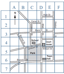 A grid reference identifies a region on a map. Coordinates and gridlines are used to refer to specific features or locations. For example, in the map below, the school is located at the grid reference C4.