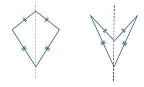 A kite may be convex as shown in the diagram above to the left or non-convex as shown above to the right. The axis of symmetry of the kite is shown.