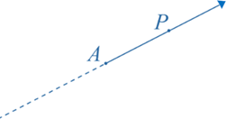 Any point A on a line divides the line into two pieces called rays. The ray AP is that ray which contains the point P (and the point A) and extends toward infinity. The point A is called the vertex of the ray.