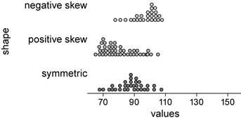 These three distribution shapes are illustrated in the parallel dot plot display below.