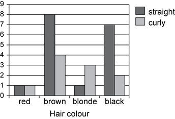 A side-by-side column graph can be used to organise and display the data that arises when a group of individuals or things are categorised according to two or more criteria; for example, the side-by-side column graph below displays the data obtained when 27 children are categorised according to hair type (straight or curly) and hair colour (red, brown, blonde, black). The legend indicates that blue columns represent children with straight hair and red columns children with curly hair.
