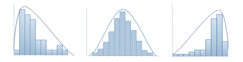 In the diagrams below, the histogram to the left is positively skewed. Data values are concentrated at the beginning of the number line, causing the graph to have a long tail to the right and a very short tail to the left. The histogram to the right is negatively skewed. Data values are concentrated further right along the number line, causing the graph to have a long tail to the left and a very short tail to the right. The mode, median and mean will not coincide.