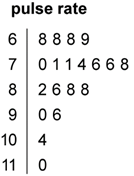 In this plot, the stem unit is ‘10’ and the leaf unit is ‘1’. Thus the top row in the plot 6 | 8 8 8 9 displays pulse rates of 68, 68, 68 and 69.