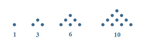 A triangular number is the number of dots required to make a triangular array of dots in which the top row consists of just one dot, and each of the other rows contains one more dot than the row above it. So the first triangular number is 1, the second is 3=1+2, the third is 6 (=1+2+3) and so on.