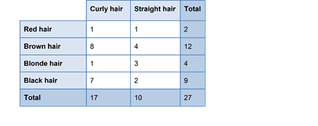A two-way table is commonly used to for displaying the two-way frequency distribution that arises when a group of individuals or things are categorised according to two criteria; for example, the two-way table below displays the two-way frequency distribution that arises when 27 children are categorised according to hair type (straight or curly) and hair colour (red, brown, blonde, black).