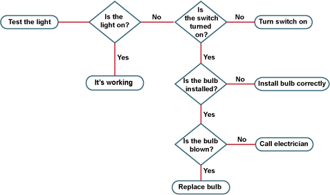 Making a decision between one of two or more actions depending on sets of conditions and the data provided. For example, in testing whether a light works, the following algorithm uses branching: