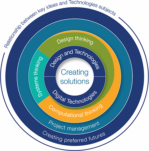 The curriculum for each of Design and Technologies and Digital Technologies describes the distinct knowledge, understanding and skills of the subject and, where appropriate, highlights their similarities and complementary learning. This approach allows students to develop a comprehensive understanding of traditional, contemporary and emerging technologies. It also provides the flexibility – especially in the primary years of schooling – for developing integrated teaching programs that focus on both Technologies subjects and other learning areas. Figure 1 shows the relationship between the overarching idea, key ideas and subjects of the Technologies learning area.