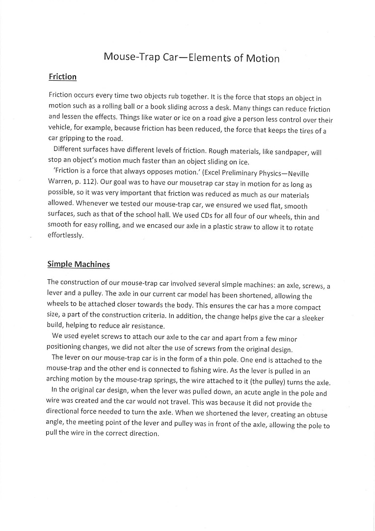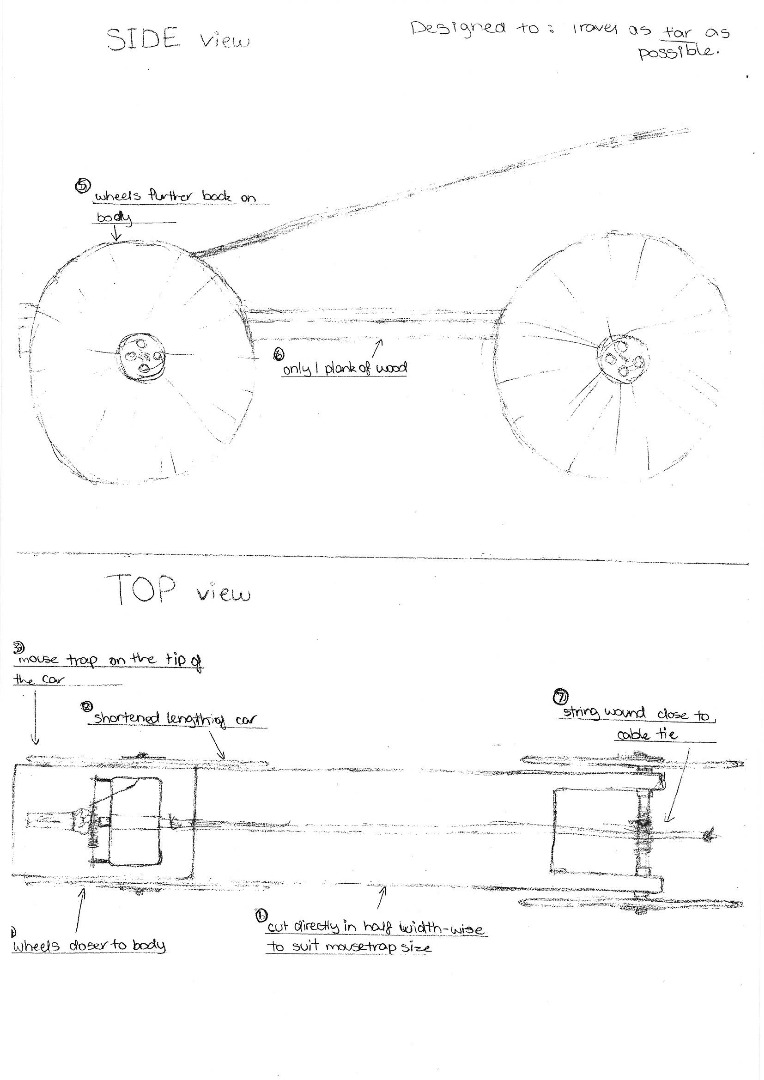 Students were given a mouse trap dragster and asked to describe its existing features. They were then given a design brief that required them to modify the dragster so that it either travelled as fast or as far as possible. They needed to test their design, record results and draw a conclusion based on those results.
